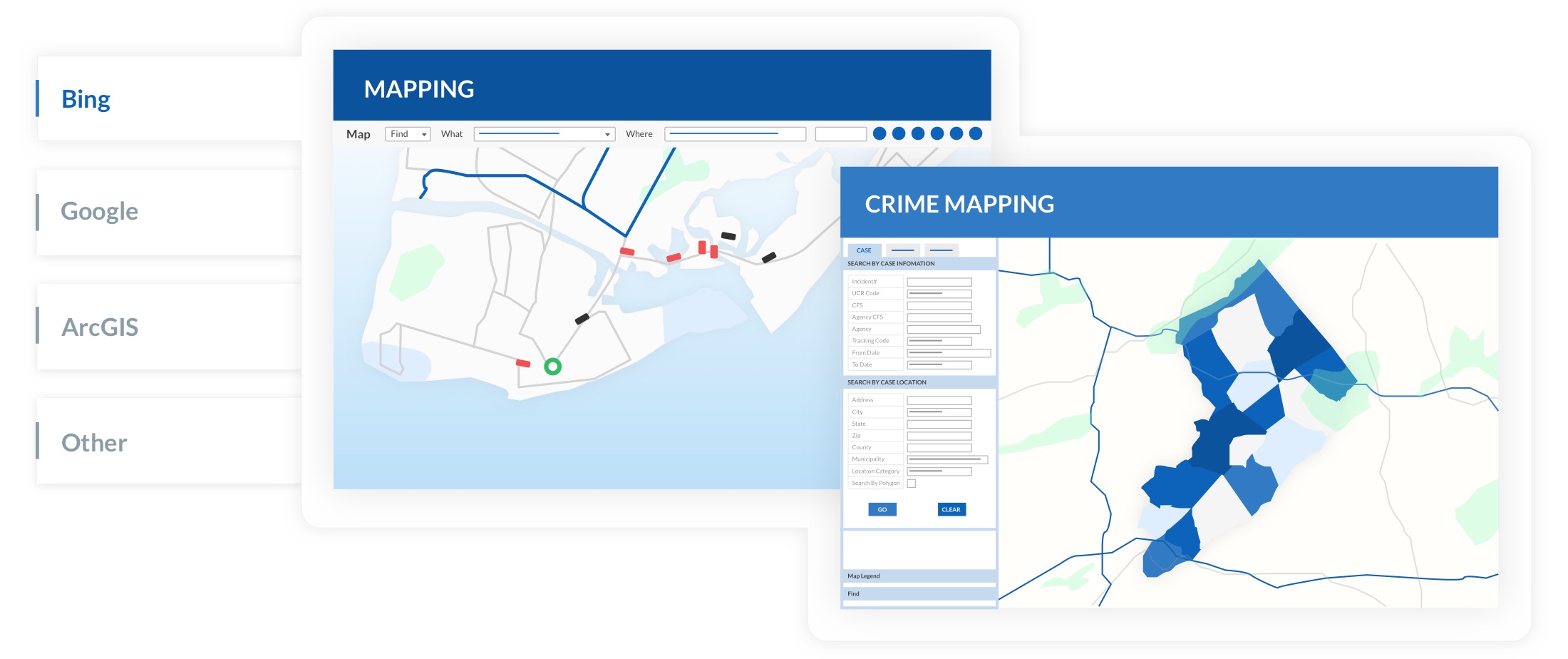Interactive GIS mapping technology assists with dispatch, unit location tracking, unit recommendations, geo-verification, crime mapping, multidimensional data analysis, search, and other functions. It supports multiple mapping platforms such as Bing, Google, and ArcGIS with several view options and customizable map layers.