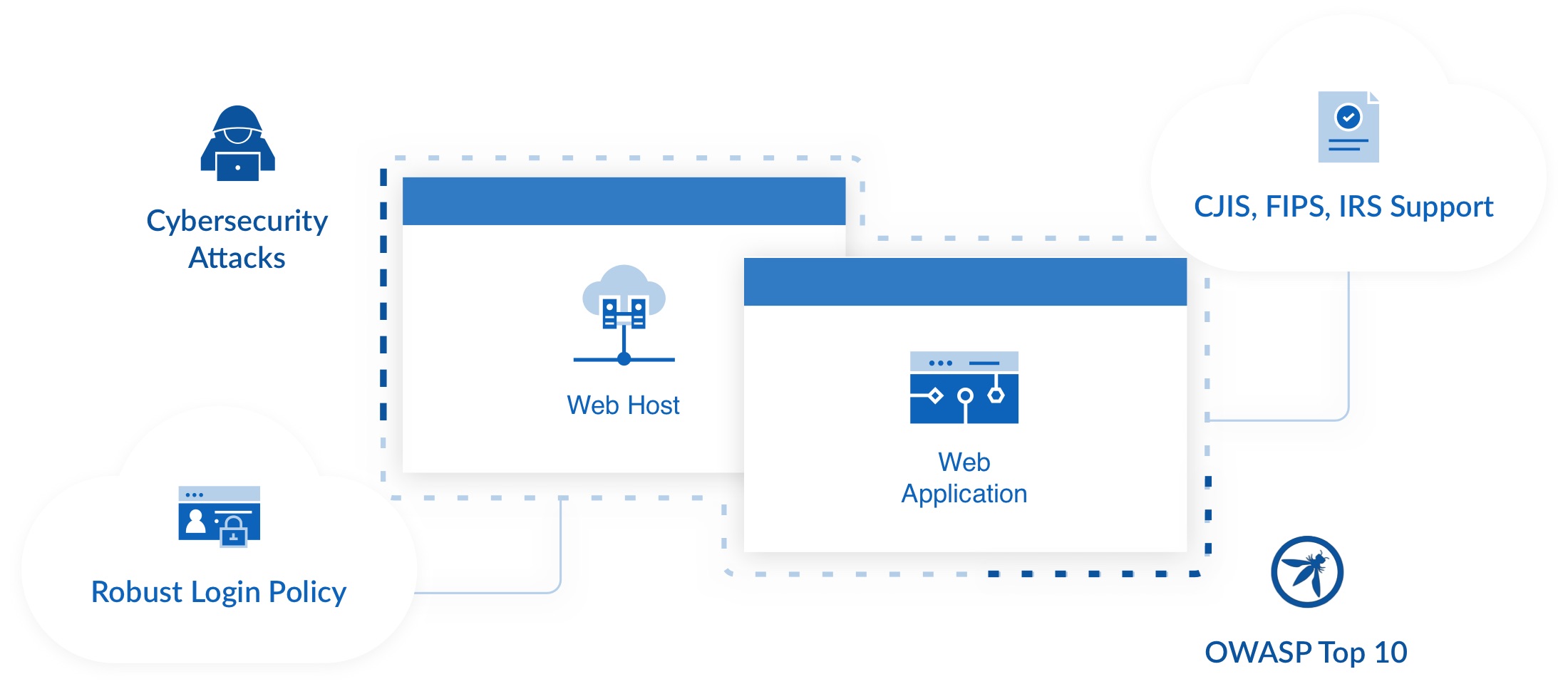 Effective security methodology eliminates security risks and vulnerabilities defined in Open Web Application Security Project (OWASP) Top 10 to ensure that sensitive criminal justice information is fully protected. Traditional applications lack robust security controls and are vulnerable to SQL injection, XSS, and other attacks. With integrated government cloud security features and strict authority control, CSI’s security mechanism is fully compliant with CJIS rules, FIPS, IRS Safeguards Audit Requirements, and other national security requirements.